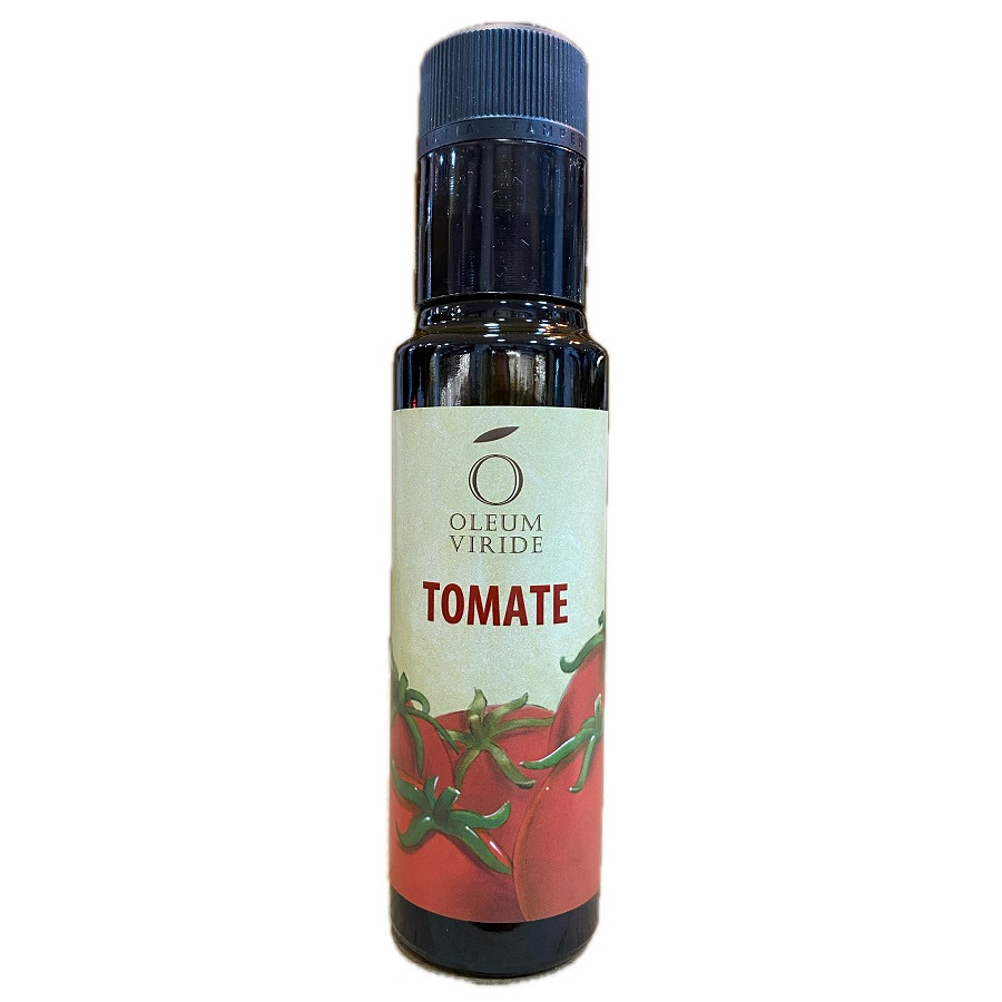 Aceite de oliva virgen extra con tomate Oleum Viride 100ml de Zahara de la Sierra. Sabor mediterráneo ideal para tostadas y ensaladas.