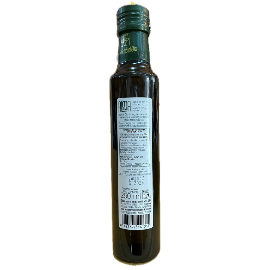 El Aceite de Oliva Virgen Extra Almaoliva Gran Selección 250 ml es un aceite gourmet de alta calidad elaborado por Almazaras de la Subbética, referente internacional en la producción de aceites excepcionales. Este coupage, resultado de la mezcla magistral de las variedades Picuda, Hojiblanca y Picual, ofrece una experiencia sensorial única que refleja toda la riqueza y el carácter del olivar andaluz. Obtenido mediante extracción en frío y a partir de aceitunas cuidadosamente seleccionadas, presenta un frutado verde medio-alto con matices de hierba recién cortada, tomatera, manzana verde y almendra. En boca destaca por su armonía y complejidad, con un equilibrio perfecto entre amargor y picor, y un retrogusto que invita a seguir degustándolo. El formato de 250 ml es ideal para uso diario en cocina o mesa, especialmente para consumir en crudo en tostadas, ensaladas, verduras o pescados, realzando los sabores naturales de cada plato. También es perfecto como detalle gourmet o regalo para los amantes del buen aceite. Aunque este aceite no pertenece a la Denominación de Origen Protegida Priego de Córdoba, mantiene la calidad y el prestigio de los aceites de Almazaras de la Subbética, empresa premiada por su compromiso con la sostenibilidad y la excelencia oleícola. Disponible en Aires de Cádiz, tanto en nuestra tienda física en Calle San Francisco nº 15 (Cádiz capital) como en nuestra tienda online www.airesdecadiz.com , donde podrás descubrir una cuidada selección de aceites virgen extra y productos gourmet de toda España.