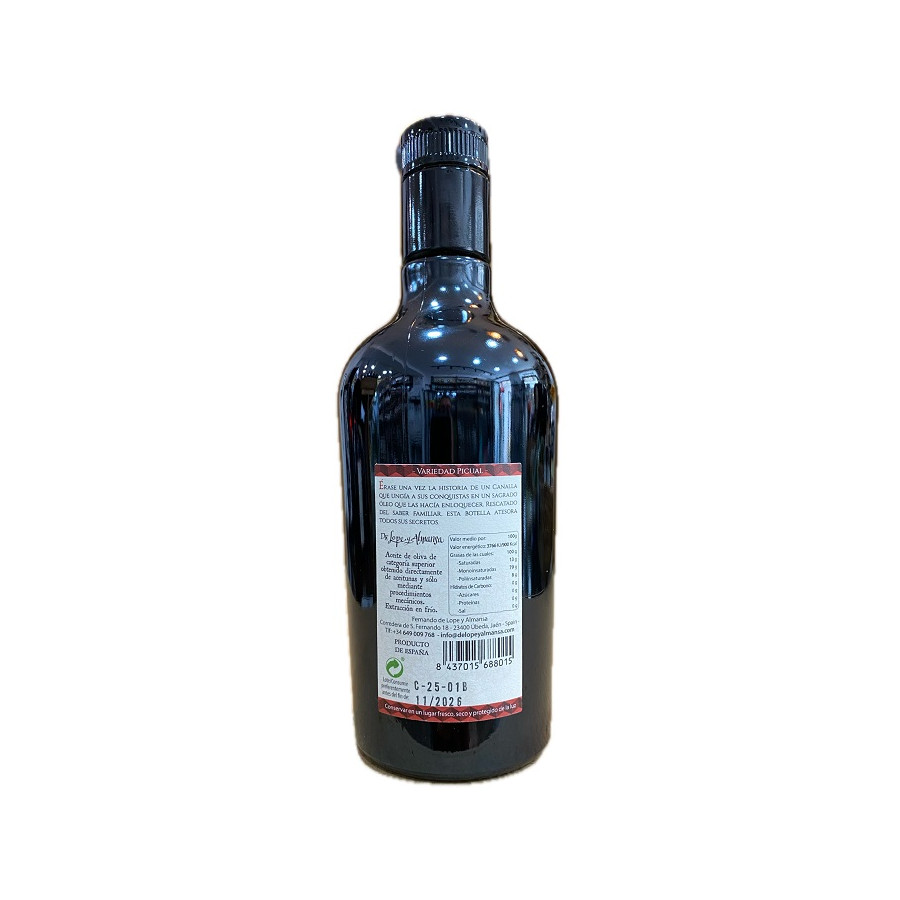 El aceite de oliva virgen extra Canalla en botella de 500 ml es la perfecta fusión entre tradición y modernidad, una joya oleícola de la almazara Fernando de Lope y Almansa en Úbeda (Jaén). Este AOVE de autor, elaborado exclusivamente con aceitunas Picual de primera cosecha, se distingue por su carácter intenso y elegante, resultado de una molienda en frío que preserva cada matiz aromático y nutricional. Su perfil sensorial destaca por un frutado verde vibrante, con notas frescas de hierba cortada, tomate verde y almendra, complementadas con un picor y amargor equilibrados que despiertan el paladar sin dominarlo. Este aceite de 500 ml es ideal para quienes aprecian un AOVE con personalidad, capaz de realzar desde una simple tostada hasta elaboraciones gastronómicas de alta cocina. El envase, diseñado pensando en el consumidor gourmet, combina funcionalidad y estética, asegurando la conservación óptima del aceite frente a la luz y el aire, preservando así su frescura y calidad intactas. Canalla 500 ml es más que un aceite: es una experiencia sensorial que conecta la historia y el terroir de Úbeda con la innovación en cada gota. Perfecto para tiendas exclusivas, regalos selectos y clientes que buscan productos premium con alma.