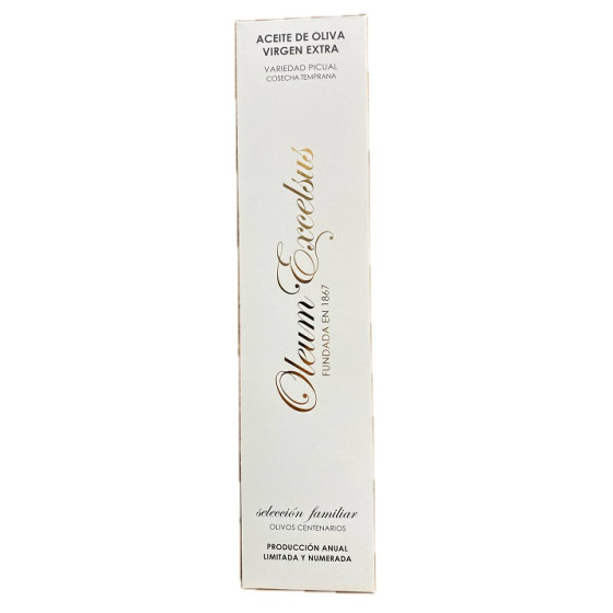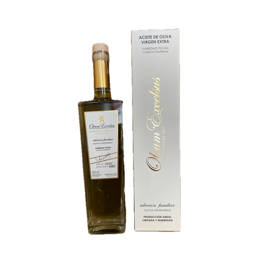 Oleum Excelsus es un aceite de oliva virgen extra de producción limitada, elaborado en la prestigiosa Sierra de Jaén, cuna mundial del mejor AOVE. Procedente exclusivamente de olivos centenarios de la variedad Picual, este aceite captura la esencia del terreno y el clima mediterráneo que le confieren un carácter único e inconfundible. Su perfil sensorial se caracteriza por una intensidad aromática que combina matices frescos de hierba recién cortada, tomate verde y almendra amarga, con un fondo ligeramente picante y un toque dulce que equilibran perfectamente cada gota. Esta complejidad hace de Oleum Excelsus un aceite versátil, capaz de realzar desde ensaladas y verduras a la parrilla hasta pescados y platos de alta gastronomía. La elaboración artesanal y el cuidado extremo en cada fase de producción aseguran un producto con alta estabilidad, frescura y calidad certificada, pensado para los paladares más exigentes que buscan autenticidad y exclusividad en su mesa. Oleum Excelsus no es solo un aceite, es una experiencia sensorial que transporta a la Sierra de Jaén en cada degustación, un verdadero tesoro para los amantes del aceite de oliva virgen extra gourmet.
