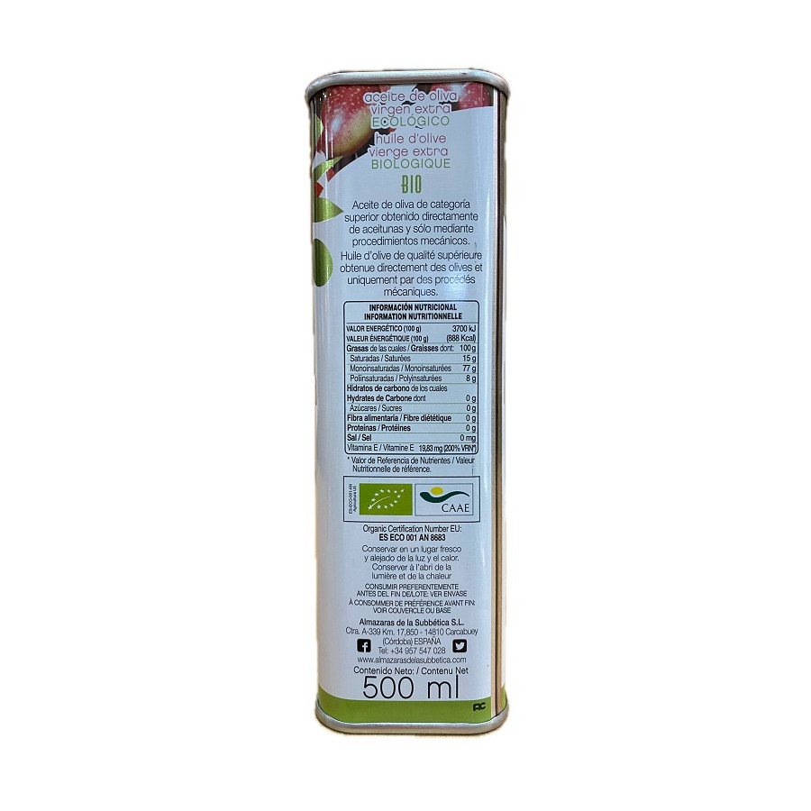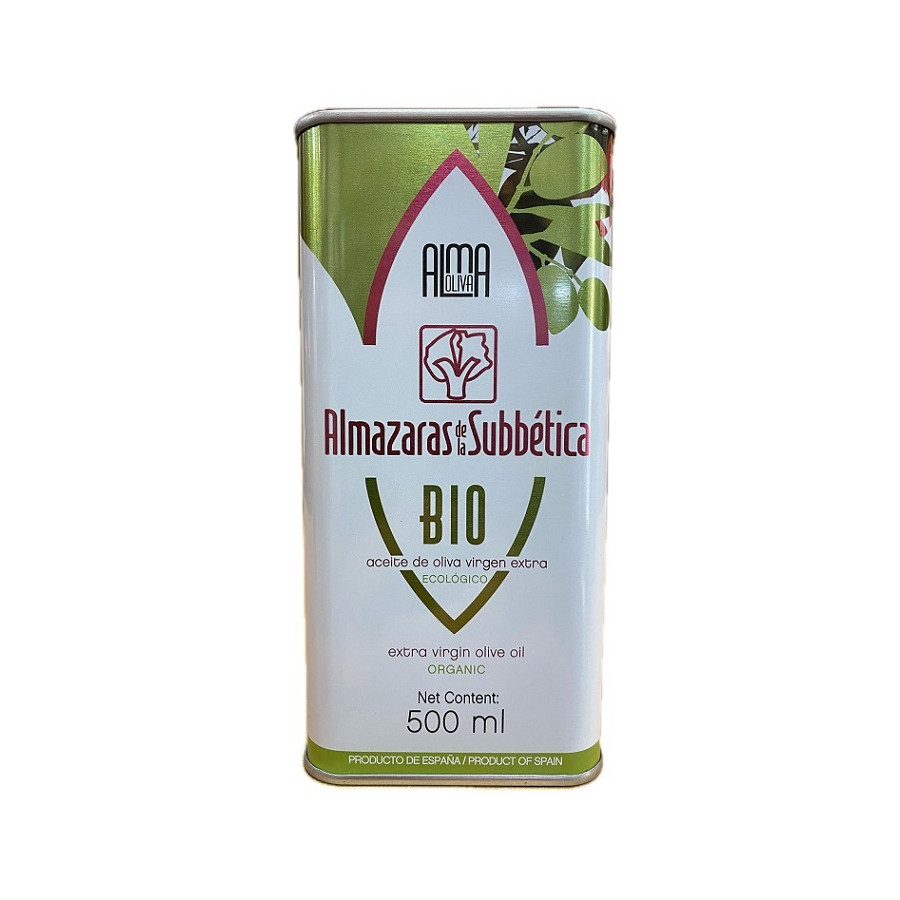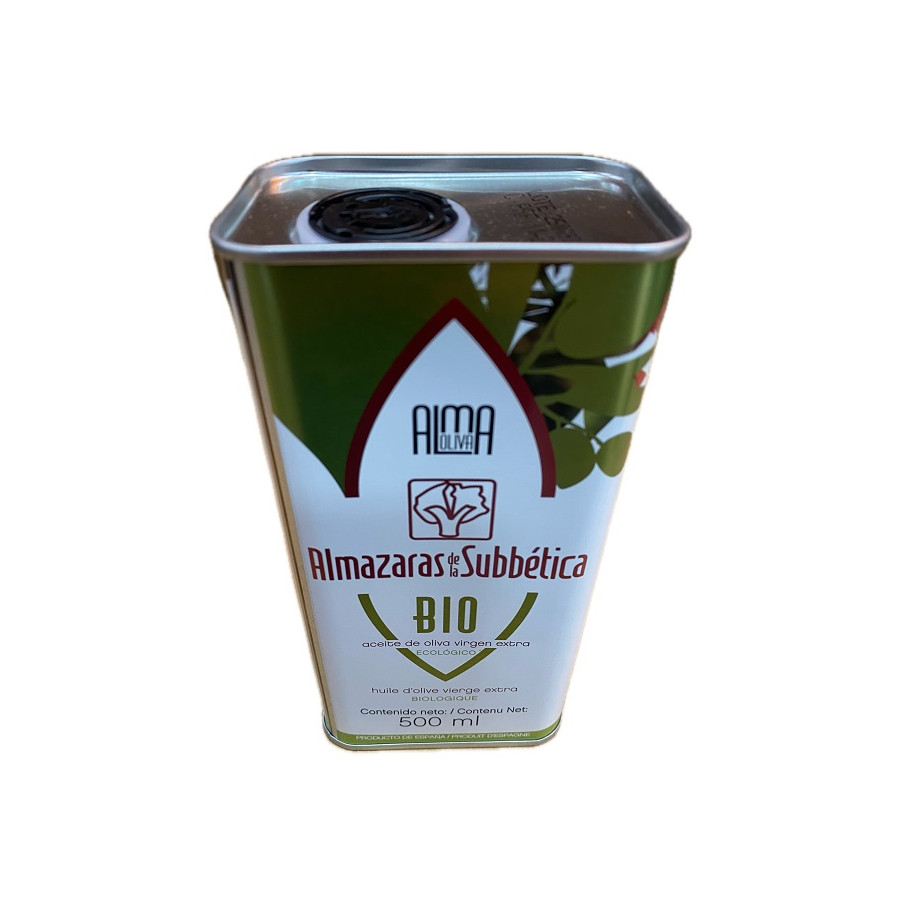 Aceite ecológico Almaoliva Bio 500 ml en lata, virgen extra de gran calidad, sabor equilibrado y sostenible de Almazaras de la Subbética.
