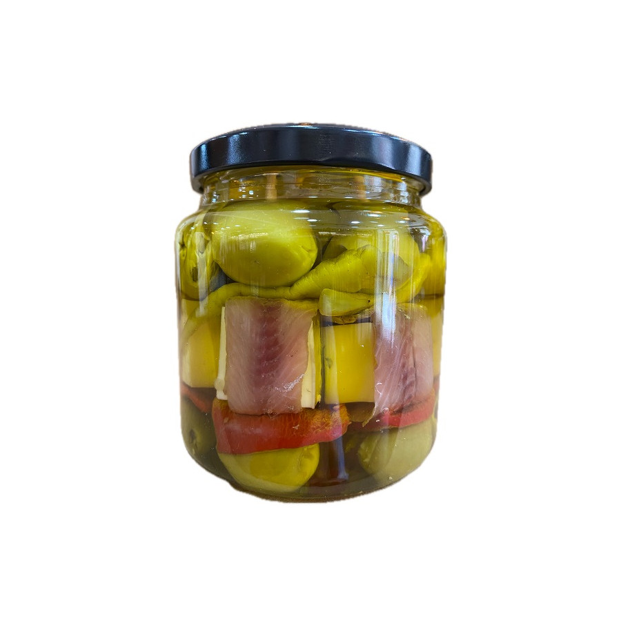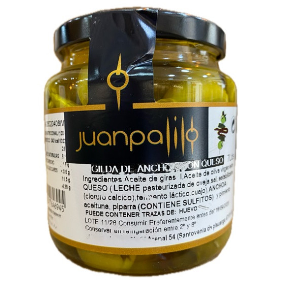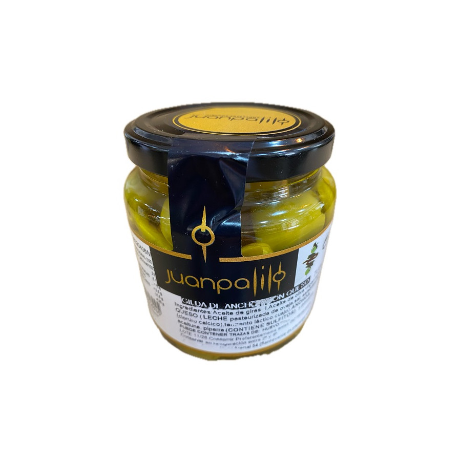 Disfruta de un clásico del tapeo reinterpretado con estas gildas de anchoa con queso en tarro de 7 unidades elaboradas por Casa Juan Palillo en Santovenia de Pisuerga, unos pinchos artesanos que combinan la intensidad y el carácter salino de la anchoa con la suavidad y cremosidad del queso, creando un equilibrio de sabores irresistible, cada gilda está cuidadosamente elaborada siguiendo procesos tradicionales que garantizan calidad, frescura y autenticidad en cada bocado, perfecta para servir como aperitivo gourmet, acompañar tablas variadas o sorprender en reuniones con un producto listo para consumir, su formato en tarro permite conservar todas sus ??? organolépticos y disfrutar de una experiencia gastronómica práctica y deliciosa en cualquier momento, ideal para maridar con vinos blancos, vermuts o cervezas, aportando un toque sofisticado y diferente a tu mesa, una propuesta que refleja la esencia del buen tapeo español con un enfoque artesanal y de alta calidad. Disponible en Aires de Cádiz, tu tienda gourmet en Calle San Francisco nº 15, Cádiz capital, y también online en www.airesdecadiz.com .