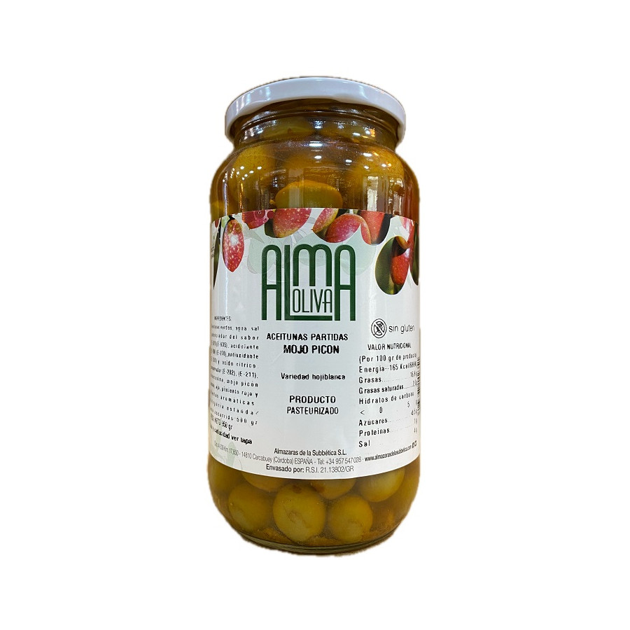 ACEITUNAS PARTIDAS MOJO PICÓN 950 gr VARIEDAD HOJIBLANCA ALMA OLIVA