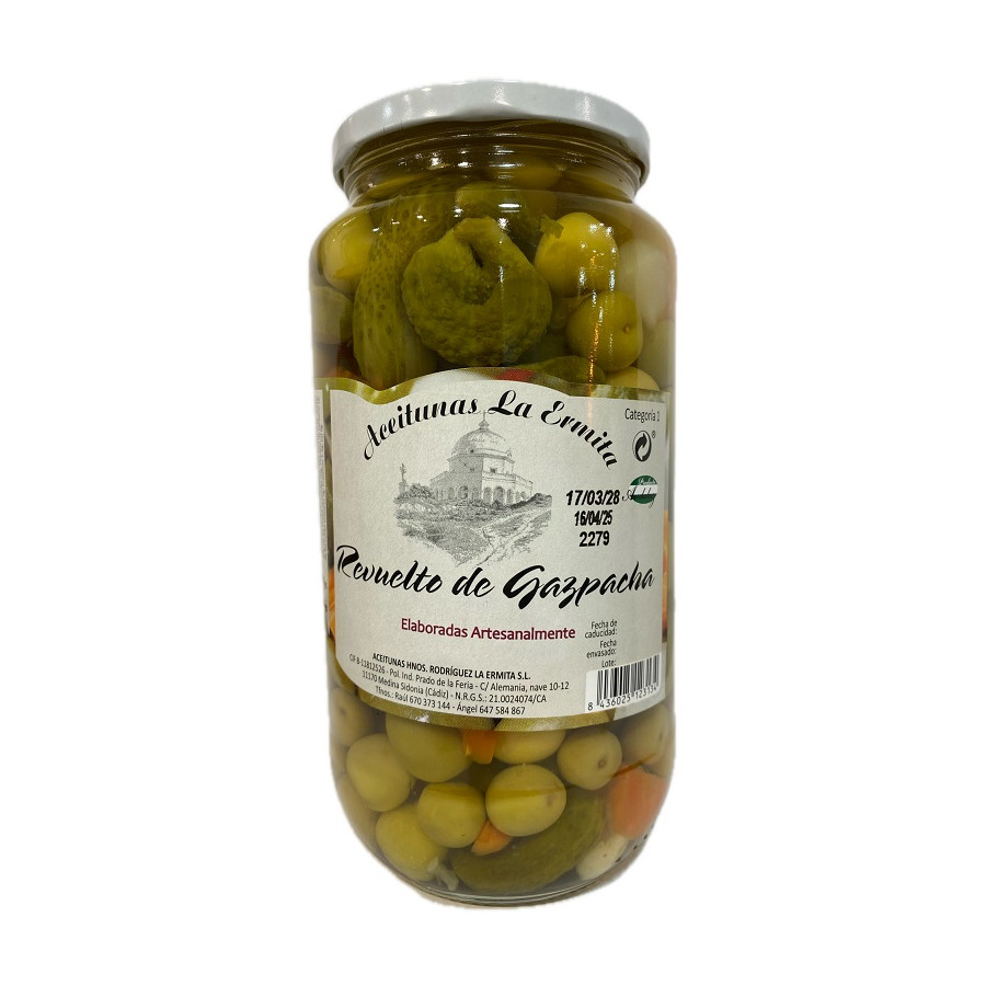 El Revuelto Gazpacha La Ermita 1.350 g (600 g escurrido) es una combinación única de encurtidos y aceitunas elaborada por la empresa gaditana Aceitunas La Ermita, en Medina Sidonia. Este producto artesanal reúne en un solo tarro aceitunas de la variedad Verdial, pepinillos crujientes, cebollitas dulces, coliflor y zanahoria, creando una mezcla equilibrada en sabor, textura y frescura. Cada ingrediente ha sido seleccionado cuidadosamente y elaborado con métodos tradicionales, lo que garantiza un aperitivo natural, sabroso y saludable. El resultado es un revuelto versátil y lleno de matices, ideal para disfrutar en tapas, ensaladas, reuniones familiares o como guarnición en platos gourmet. El envase de vidrio de 1.350 g, con 600 g de peso escurrido, lo convierte en una opción práctica y generosa, perfecta para quienes valoran la calidad de los productos gaditanos. Sin conservantes artificiales, este revuelto encurtido conserva el sabor auténtico de la tradición andaluza. Puedes encontrar el Revuelto Gazpacha La Ermita en nuestra tienda física Aires de Cádiz, situada en la Calle San Francisco nº 15 de Cádiz capital, donde ofrecemos una cuidada selección de productos gourmet de la provincia. También está disponible en nuestra tienda online www.airesdecadiz.com, para que disfrutes de los mejores sabores de Cádiz desde cualquier lugar de España.