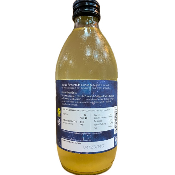 Kombucha ecológica con té verde, jazmín y yerba mate. Energía natural y sabor floral. Elaborada en Conil de la Frontera, Cádiz.