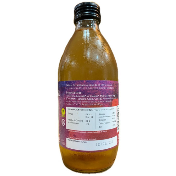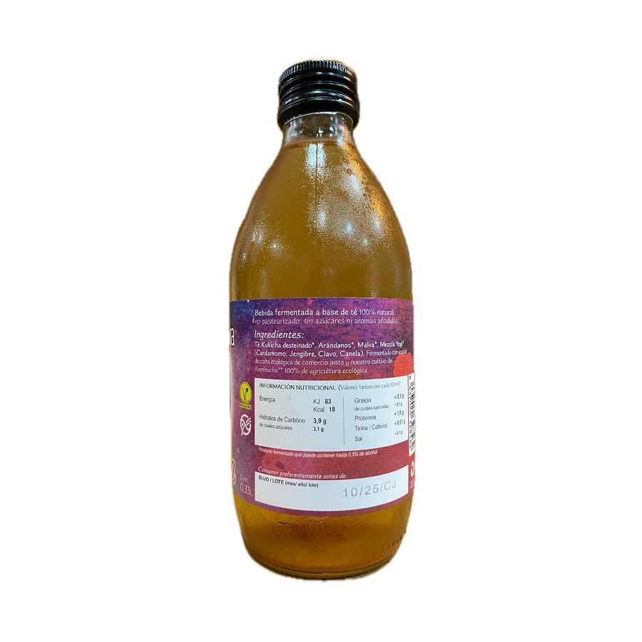 Kombucha ecológica con té kukicha, arándanos y especias Yogi. Relajante y probiótica. Elaborada en Conil de la Frontera, Cádiz.