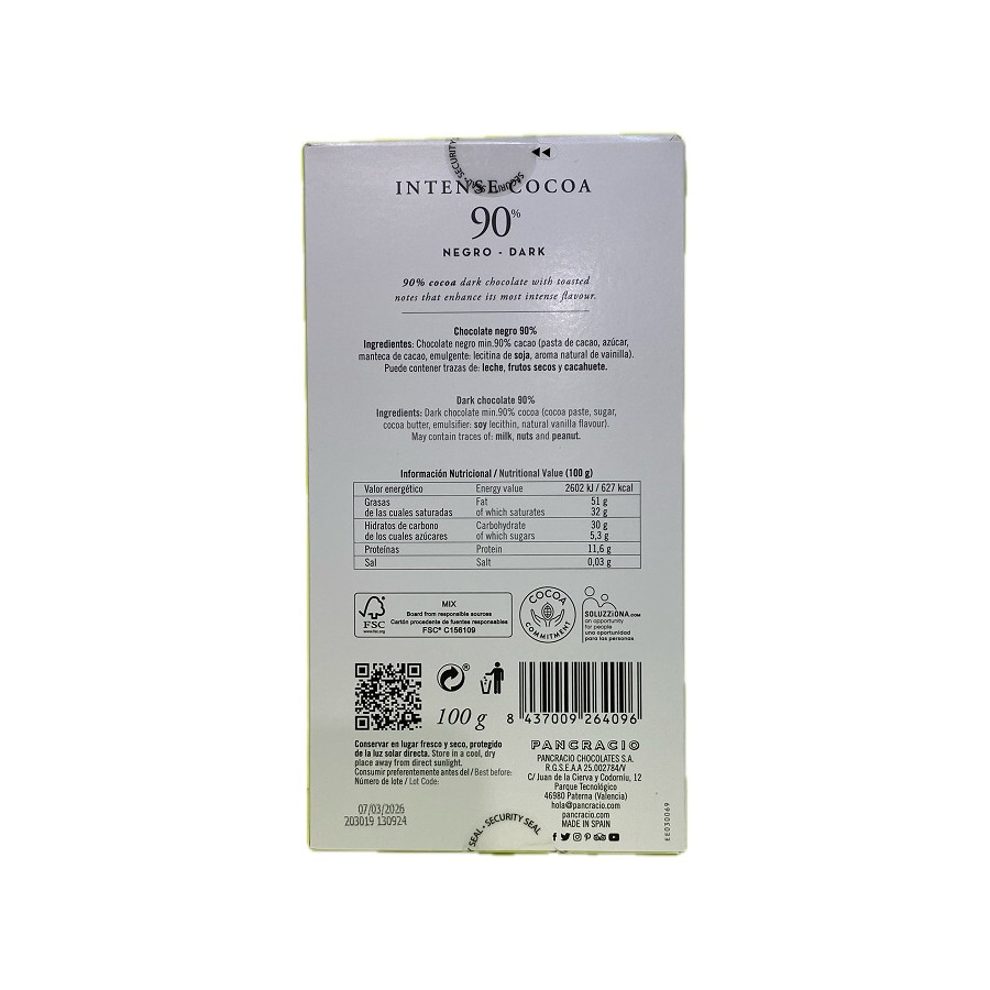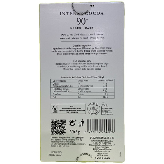 TABLETA INTENSE COCOA 90% PANCRACIO – CHOCOLATE NEGRO GOURMET 100G