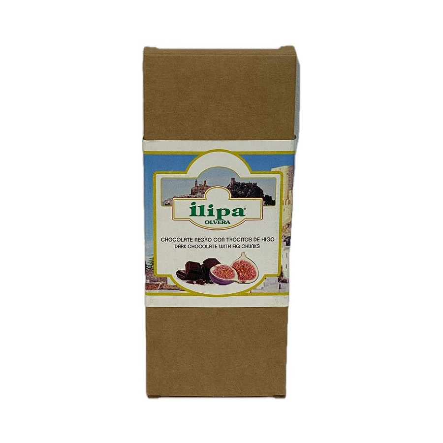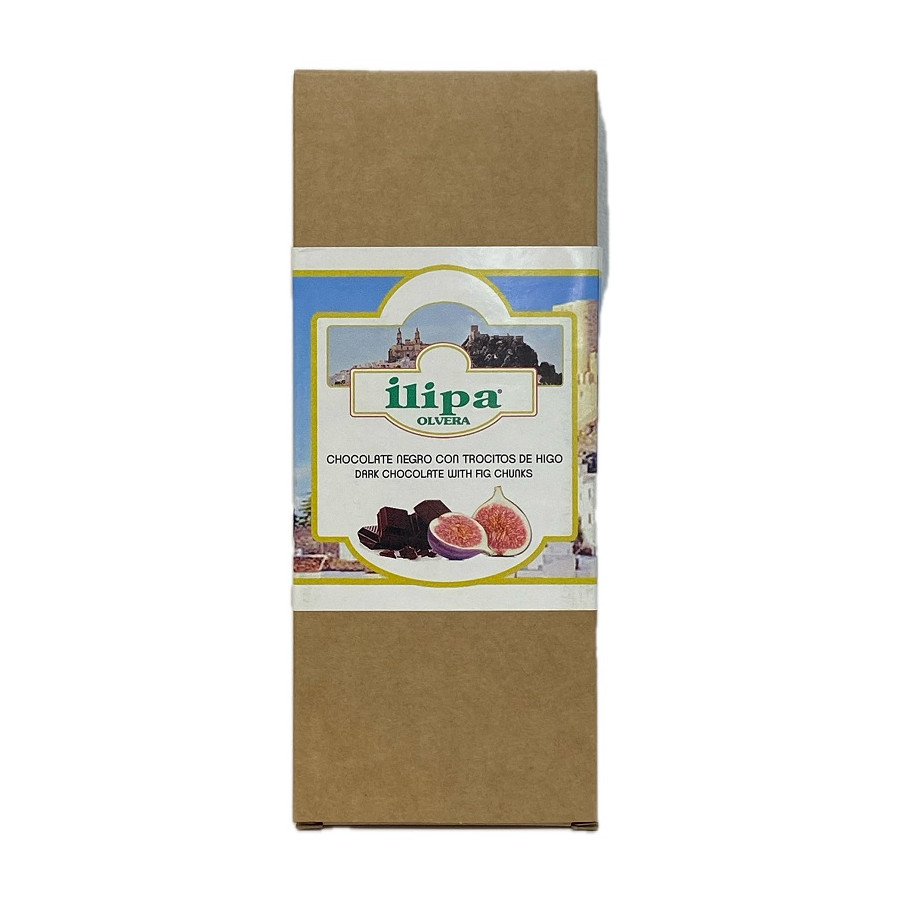 Tableta de chocolate negro 70% Ilipa 100g con trocitos de higo, sin gluten, elaborado en Olvera, Cádiz. Sabor intenso y artesanal.