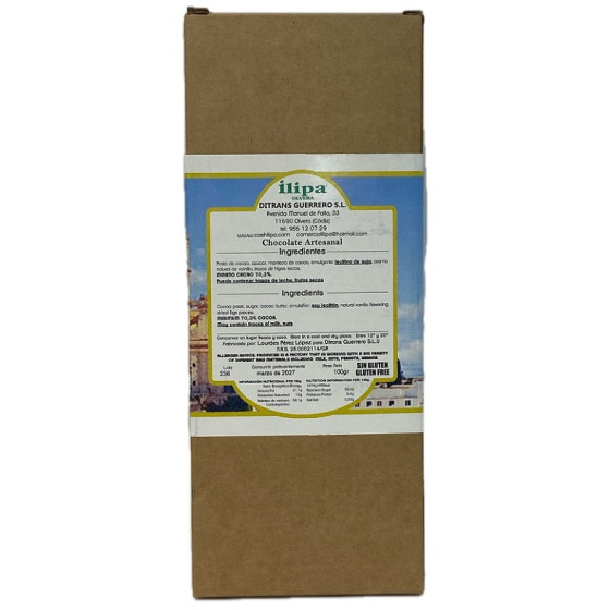 Descubre la exquisita tableta de chocolate negro 70% Ilipa de 100 gramos, elaborada en Olvera, pueblo de la sierra de Cádiz, con trocitos naturales de higo y totalmente libre de gluten. Esta tableta combina la intensidad del cacao con la dulzura y textura de los higos, ofreciendo un sabor equilibrado y delicado que deleita el paladar en cada bocado. Ideal para disfrutar sola, acompañar postres o regalar en ocasiones especiales, refleja la tradición chocolatera de la empresa Ilipa y el cuidado artesanal en cada elaboración. Disponible en Aires de Cádiz, tanto en la tienda física en Calle San Francisco nº 15, Cádiz capital, como en la tienda online www.airesdecadiz.com , este chocolate negro 70% Ilipa 100 g con trocitos de higo y sin gluten es un producto exclusivo que une sabor, calidad y tradición andaluza en cada tableta.