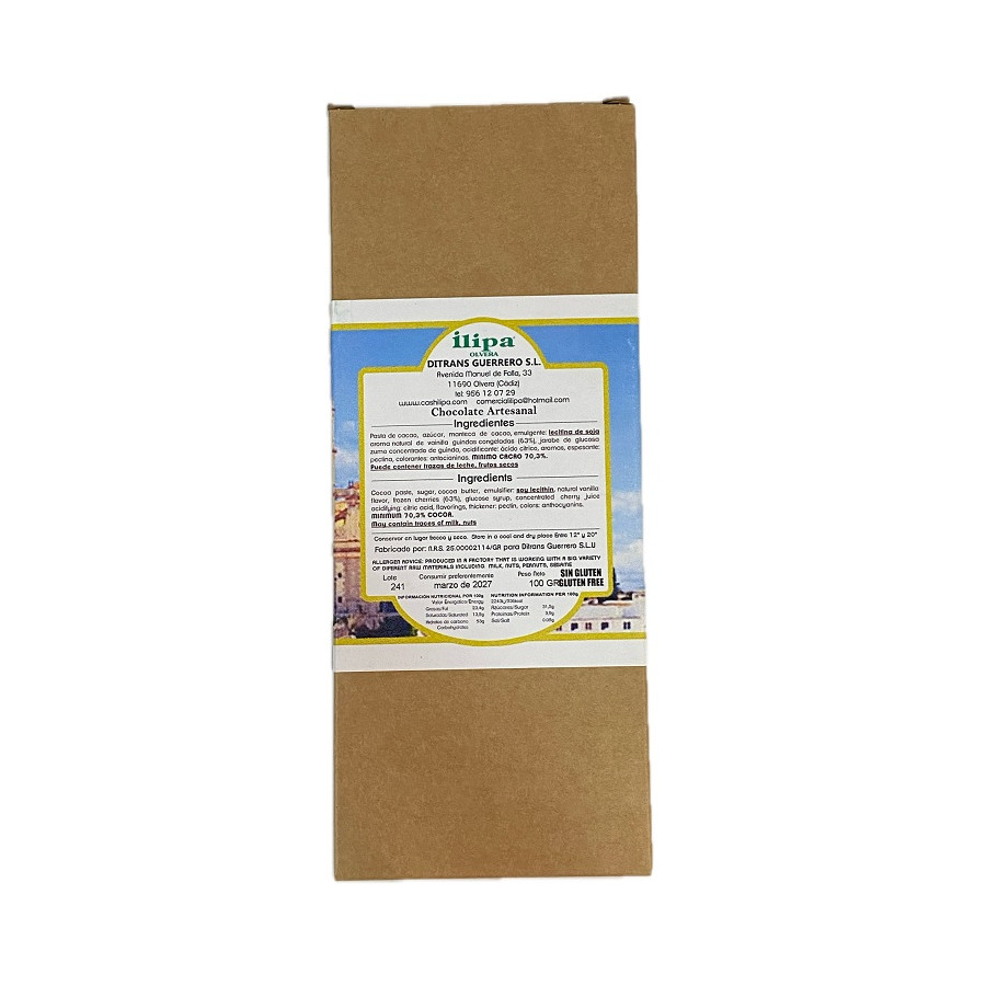 La tableta de chocolate negro 70 % con cerezas de la marca Ilipa en formato de 100 gramos es una combinación artesanal que aúna el intenso sabor del cacao de alta calidad con el dulzor y aroma natural de las cerezas seleccionadas, ofreciendo una experiencia sensorial única y equilibrada; elaborada en Olvera siguiendo métodos tradicionales, esta tableta destaca por su textura fundente y rica en matices, donde el chocolate negro potencia los sabores frutales de las cerezas, creando un contraste delicioso entre amargor y dulzor que deleita el paladar en cada bocado; perfecta para degustar sola, acompañar café o como regalo gourmet, esta tableta refleja la pasión por la chocolatería artesanal y la excelencia de Ilipa, ofreciendo un producto exclusivo, natural y lleno de personalidad que convierte cada momento en una experiencia de sabor auténtica y memorable. Disponible en Aires de Cádiz, tu tienda gourmet en Calle San Francisco nº 15, Cádiz capital, y también online en www.airesdecadiz.com .