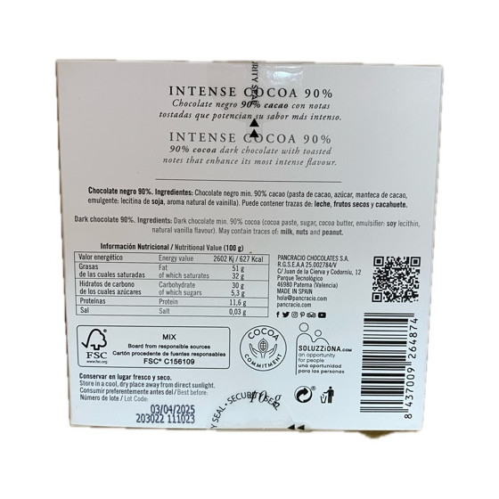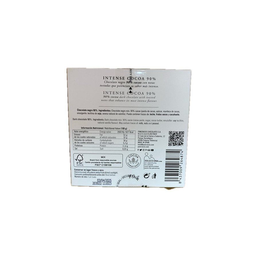 Chocolate negro 90% cacao con notas tostadas que potencian su sabor mas intenso.