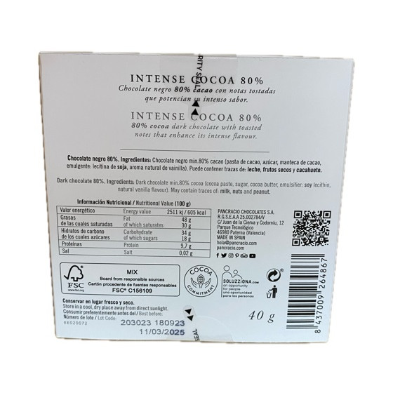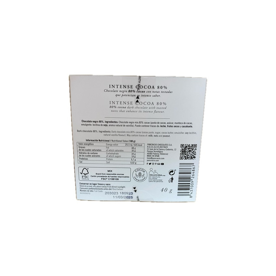 CHOCOLATE ARTESANO 80% INTENSE COCOA 40g PANCRACIO