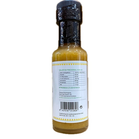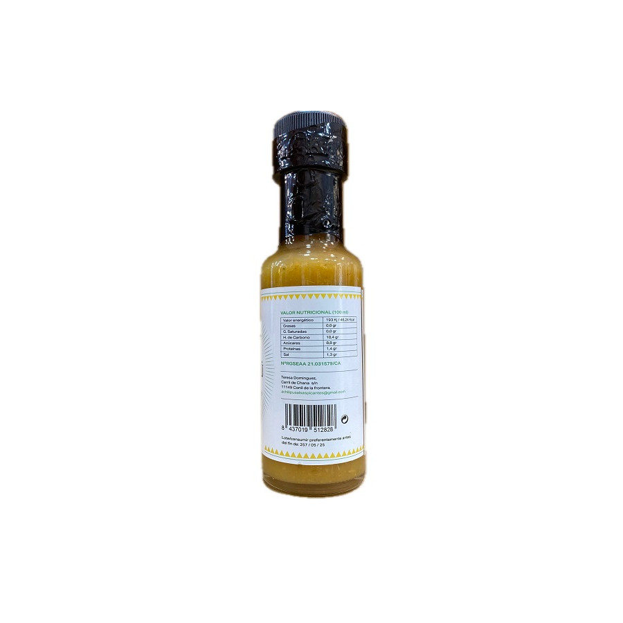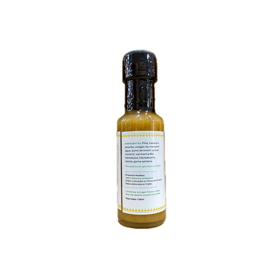 INGREDIENTES: Piña, habanero amarillo, vinagre de manzana, agua, zumo de limón, azúcar moreno, sal marina Bio, hierbaluisa, hierbabuena, menta, goma xantana. TARRO: 125 ml. Producto Andaluz 100% Natural y Artesanal. Chiles Cultivados en Picos de Aroche. Salsas elaboradas en Cádiz. Conservar en lugar fresco y seco. Una vez abierto conservar en frio.
