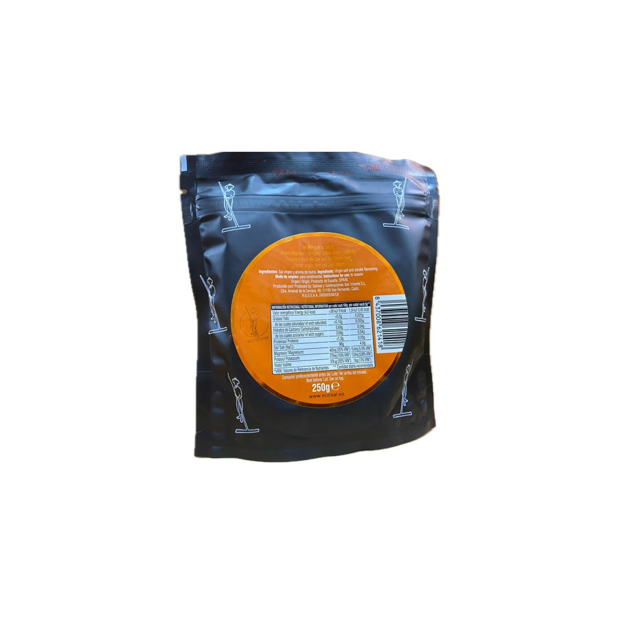 Del Mar y de la Tierra. Origen Atlántico... de Cádiz. Sabor suave y sabroso. Ingredientes: Sal Virgen y aroma de Humo.
