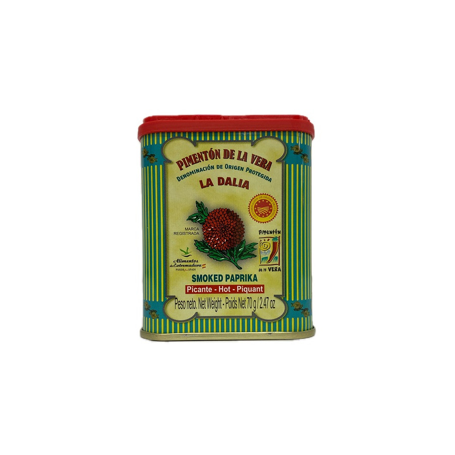 La lata de 70 grs. de Pimentón de la Vera La Dalia es el tamaño ideal para un uso doméstico por su tamaño reducido y facilidad de uso. Recomendado para todos los amantes de la buena cocina que eligen siempre los mejores ingredientes. El Pimentón de la Vera es ideal para elaboraciones como salsas, cremas, guisos o ensaladas aportando su característico sabor ahumado. Fundamental para la preparación del tradicional pulpo a la gallega. Disponible en tres variedades: dulce, agridulce o picante.