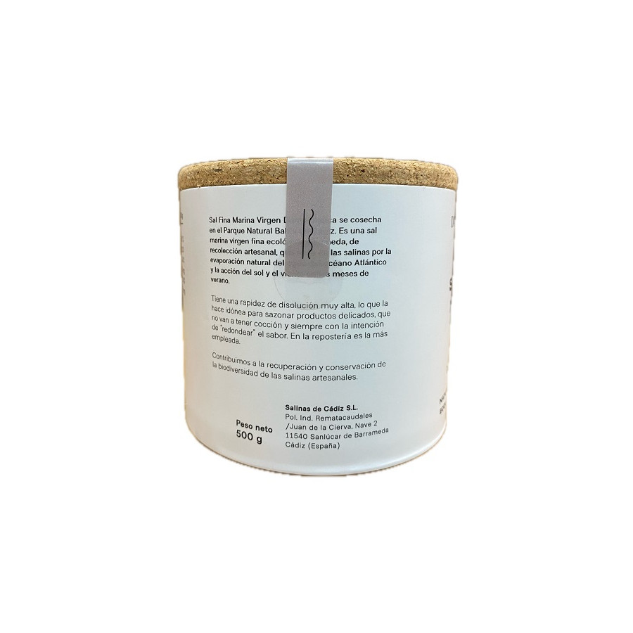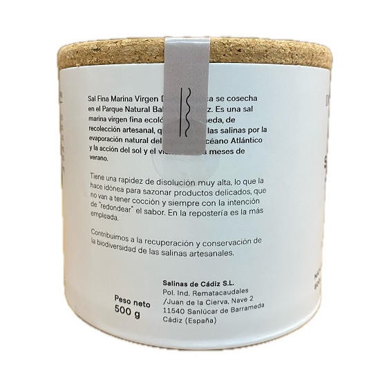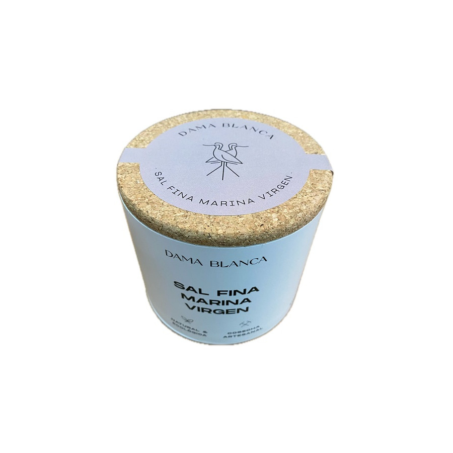 Sal Marina Virgen Fina 500 g · Dama Blanca Descubre el sabor puro del Atlántico con la Sal Marina Virgen Fina Dama Blanca, en formato de 500 gramos. Procedente de las salinas artesanales del Parque Natural de la Bahía de Cádiz, esta sal se recoge manualmente mediante métodos tradicionales que respetan el entorno y conservan su riqueza mineral natural. A diferencia de la sal refinada, esta sal marina virgen no ha sido lavada ni sometida a procesos químicos. Por eso conserva su estructura cristalina original y un sabor más intenso, natural y equilibrado. Su textura fina la hace ideal para el uso diario en todo tipo de recetas: carnes, pescados, verduras, guisos, sopas, masas de pan o repostería. Producto certificado como sal ecológica por la Unión Europea, recolectado de forma artesanal y envasado en un diseño sostenible galardonado por su compromiso con el medioambiente. Al elegir Dama Blanca, estás apoyando un proyecto familiar que fomenta la biodiversidad y protege un ecosistema único. Autenticidad, tradición y calidad desde Cádiz, en cada grano de sal.