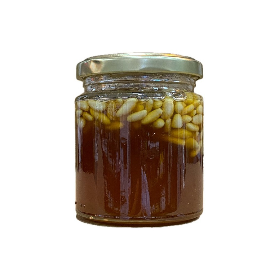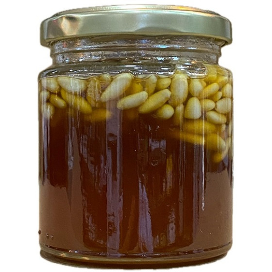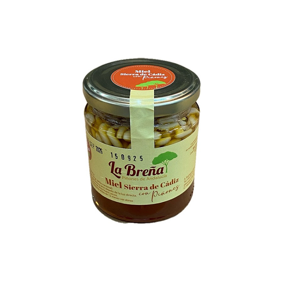 Deliciosa miel con piñones de La Breña 140 g. Sabor natural, artesanal y gourmet, ideal para postres, tostadas o quesos. Producto gaditano.