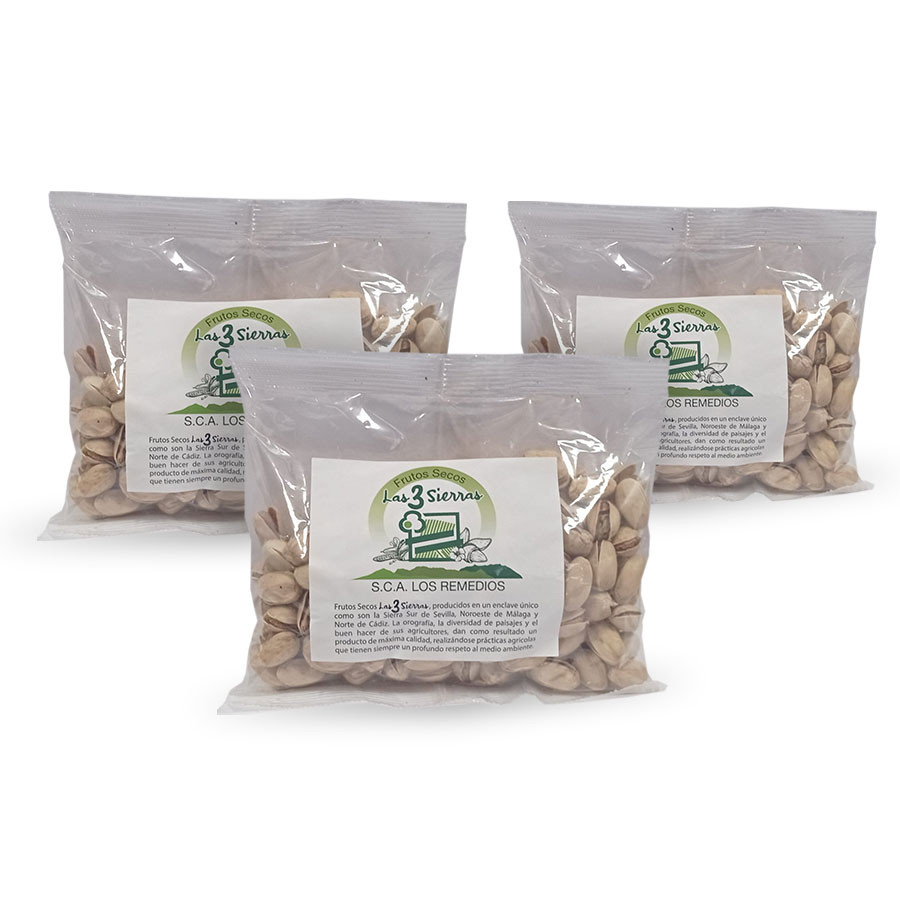 FRUTOS SECOS LAS 3 SIERRAS S.C.A. LOS REMEDIOS Frutos Secos Las 3 Sierras, producidos en un enclave único como son la Sierra Sur de Sevilla, Noroeste de Málaga y Norte de Cádiz. La orografía, la diversidad de paisajes y el buen hacer de sus agricultores, dan como resultado un producto de máxima calidad, realizándose prácticas agricolas que tienen siempre un profundo respeto al medio ambiente. Venta paquete de 200g.