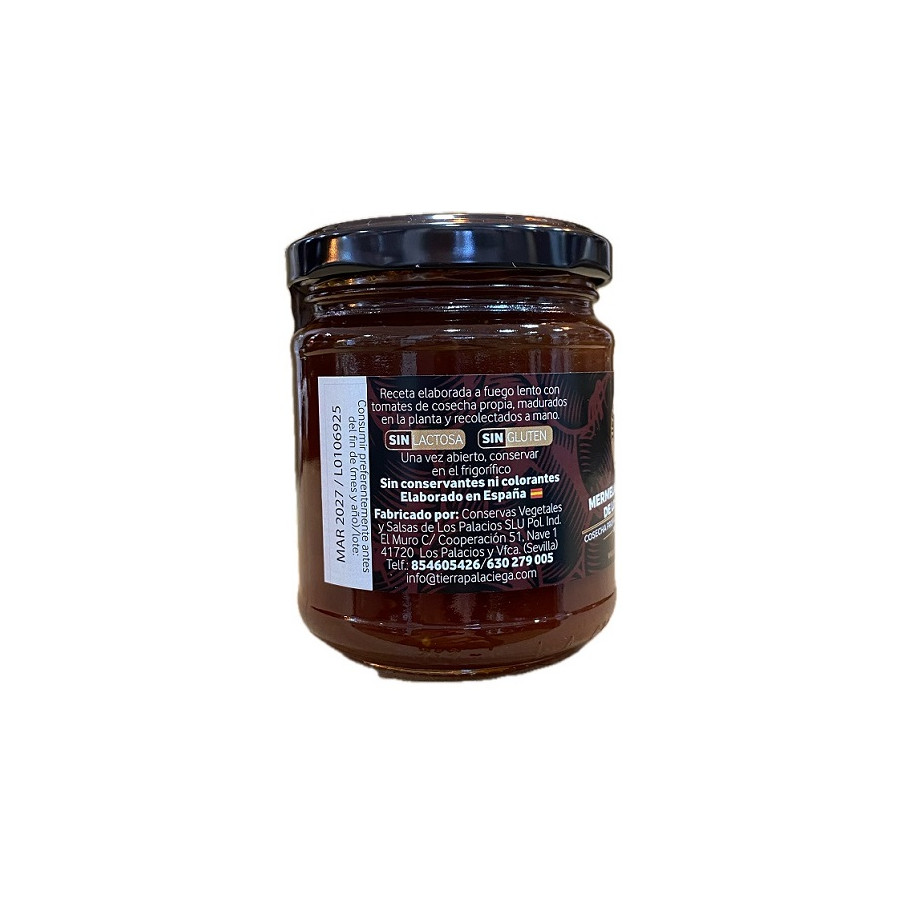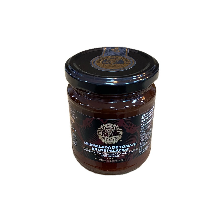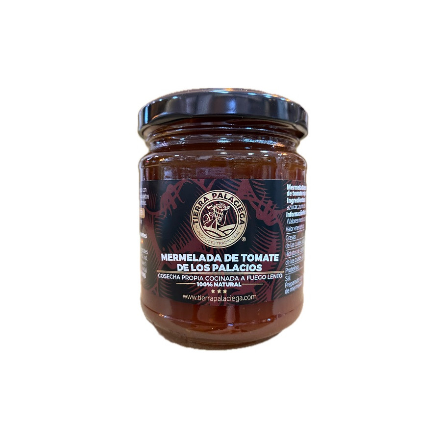 La mermelada de tomate Tierra Palaciega en tarro de cristal de 250 gramos se elabora en Los Palacios y Villafranca utilizando tomates de cosecha propia seleccionados en su punto óptimo de maduración y cocinados lentamente para conservar todo su aroma, color y sabor natural, obteniendo una textura suave y un equilibrio perfecto entre dulzor y frescura que convierte este producto en una opción versátil y sorprendente dentro de la cocina gourmet; su elaboración artesanal a fuego lento permite concentrar el sabor del tomate fresco, dando lugar a una mermelada ideal para acompañar quesos curados y semicurados, carnes, tostadas, aperitivos, empanadas o incluso para aportar un toque creativo a recetas modernas y platos de autor, convirtiéndose en un imprescindible para quienes disfrutan de contrastes dulces y salados elaborados con ingredientes naturales y de proximidad; Tierra Palaciega apuesta por productos sencillos y auténticos que ponen en valor la tradición agrícola de la zona y ofrecen una alternativa saludable y sabrosa para enriquecer cualquier despensa con sabores caseros y de calidad. Disponible en Aires de Cádiz, tu tienda gourmet en Calle San Francisco nº 15, Cádiz capital, y también online en www.airesdecadiz.com .