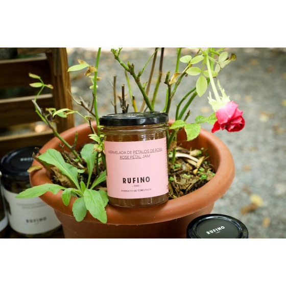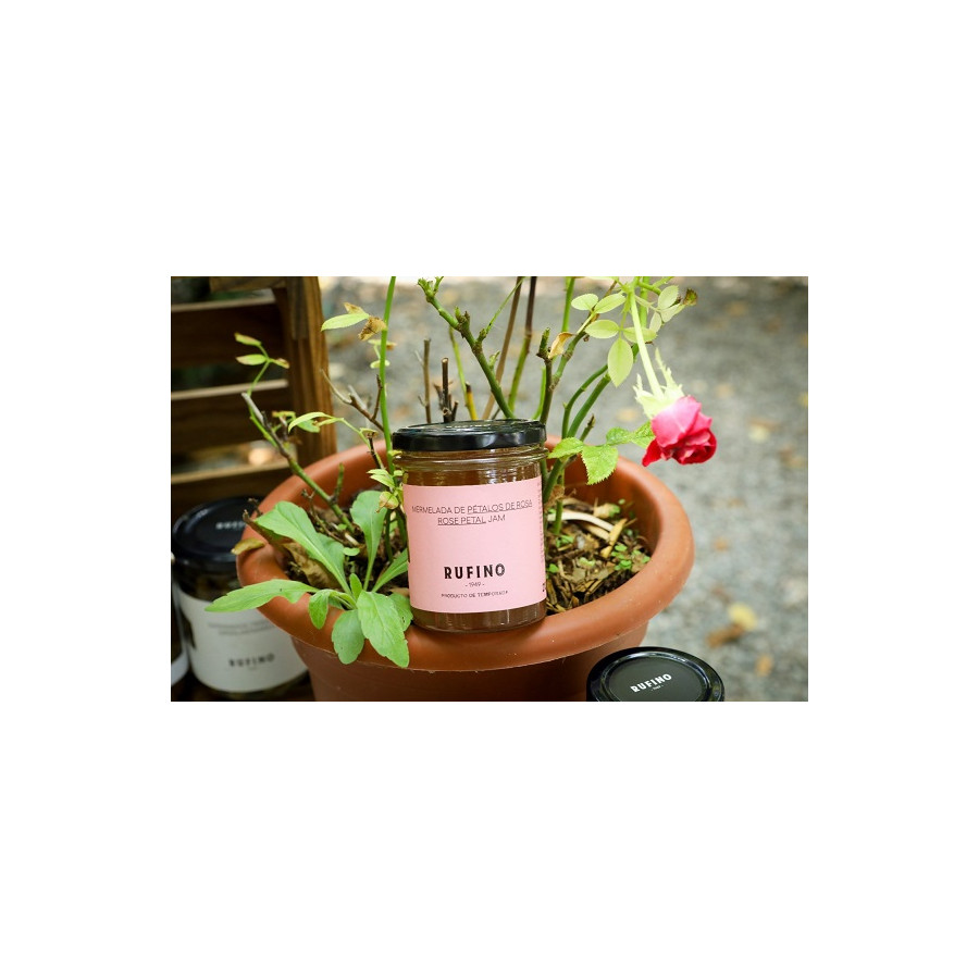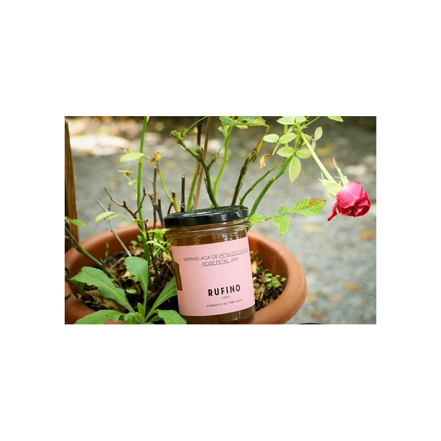 Mermelada de Pétalos de Rosa Con esta mermelada Rufino 1949 quiere aromatizar platos de cocina o postres. De la variedad De la Rosa mini ecológica de nuestra costa tropical se seleccionan los pétalos manualmente para la elaboración de la mermelada. Sin ningún tipo de colorante, simplemente el color que proporcionan los pétalos al cocerlos con el azúcar, infunde un aroma y color al plato excepcional. Es el acompañante perfecto para cremas de queso, foeis y para todo tipo de postres (bizcochos, helados…) Además le da un toque especial a los Gin Tonic. SIN COLORANTES, SIN CONSERVANTES, SIN GLUTEN Ingredientes: Pétalos de Rosa, azúcar, esencia de rosas, gelificantes (pectina, garrofin), acidulante (ácido cítrico).