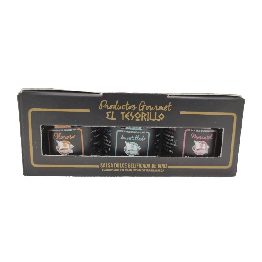 Pack compuesto de 3 botes de Mermelada de Vinos de Jerez: - 1 bote Mermelada de Vino Amontillado (40gr) -1 bote Mermelada de Vino oloroso (40gr) -1 bote Mermelada de Vino Moscatel (40gr) Los Vinos de Jerez en versión untable. Las salsas dulces gelificadas de vino El Tesorillo Gourmet están realizadas con seis tipos de vino del Marco de Jerez y cuentan con el sello de garantía de la DO Jerez-Xerés-Sherry Manzanilla de Sanlucar. Elaboradas artesanalmente en Sanlucar de Barrameda con vinos del marco de Jerez sin añadir agua, colorantes ni conservantes CONTIENEN SULFITOS. CONTIENEN UN BAJO PORCENTAJE DE ALCOHOL.