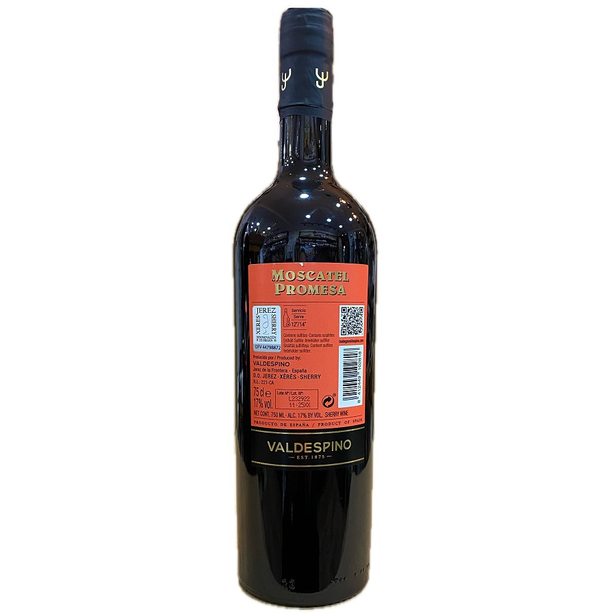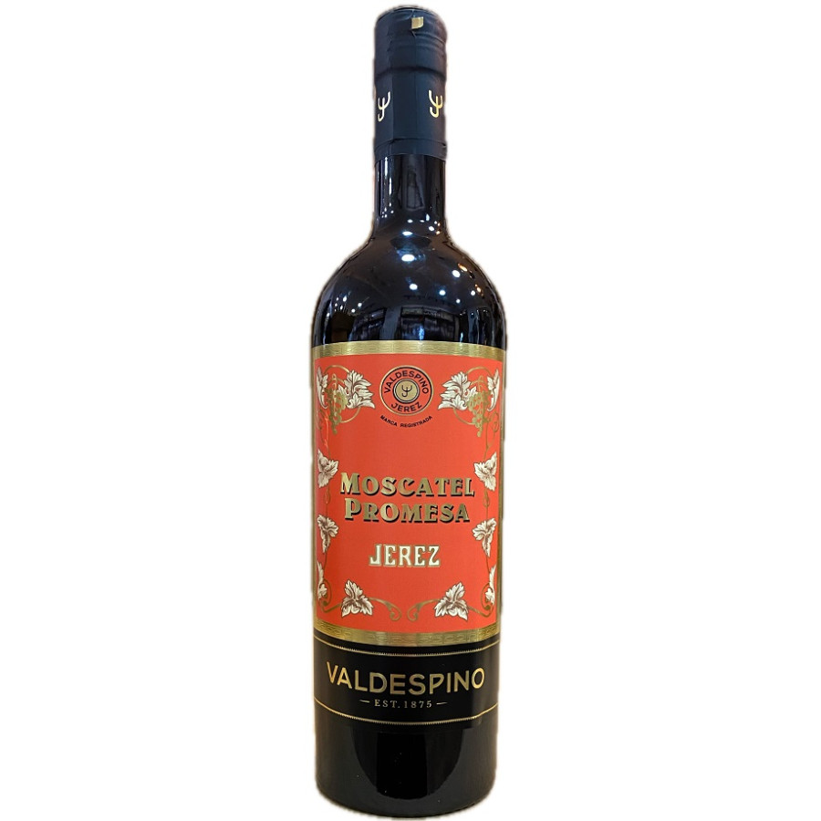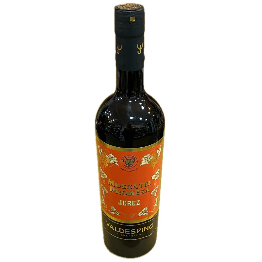Moscatel Promesa 75 cl de Bodegas Valdespino, vino dulce de Jerez con aromas florales y afrutados, ideal para postres y momentos especiales.