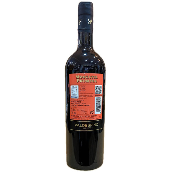 El Moscatel Promesa de Bodegas Valdespino en botella de 75 cl es un vino dulce de Jerez que destaca por su aroma intenso y elegante, donde se combinan notas florales, cítricas y frutales que aportan frescura y delicadeza en cada sorbo; su paladar es suave, equilibrado y aterciopelado, con un dulzor natural que se integra perfectamente con la acidez propia de la uva moscatel, ofreciendo un final largo y armonioso, ideal para maridar con postres, frutas, pastelería fina o para disfrutar solo como vino de meditación; elaborado por una de las bodegas más tradicionales y prestigiosas del Marco de Jerez, el Moscatel Promesa refleja el cuidado en la vendimia, la selección de uvas y la experiencia centenaria de Valdespino, convirtiéndose en un vino que combina calidad, tradición y carácter, perfecto para quienes buscan un producto gourmet auténtico y representativo de la excelencia vitivinícola andaluza. Disponible en Aires de Cádiz, tu tienda gourmet en Calle San Francisco nº 15, Cádiz capital, y también online en www.airesdecadiz.com .
