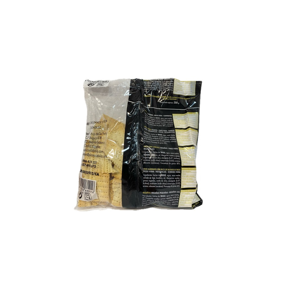 Las regañás artesanales Sidonia en bolsa de 200 g son un producto tradicional elaborado con esmero en Medina Sidonia (Cádiz) por la reconocida empresa Fábrica de Panes y Picos Sidonia S.L.. Estas regañás destacan por su textura crujiente y sabor equilibrado, resultado de una receta auténtica que combina harina de trigo de alta calidad, aceite de oliva virgen extra y una fermentación natural que garantiza un pan ligero y delicioso. Perfectas para acompañar tapas, quesos, salazones o simplemente para disfrutar con un buen aceite de oliva, las regañás Sidonia reflejan la tradición panadera gaditana y la excelencia en cada bocado. Su presentación en bolsa de 200 g las convierte en un producto cómodo y práctico para el consumo diario o para compartir en reuniones. En Aires de Cádiz, disponibles tanto en nuestra tienda física en la Calle San Francisco nº 15 de Cádiz capital como en nuestra tienda online, te ofrecemos este producto exclusivo que lleva el auténtico sabor de la Sierra de Cádiz a tu mesa, con la calidad y confianza que solo un productor local puede garantizar.