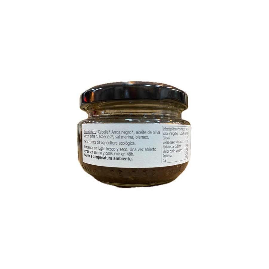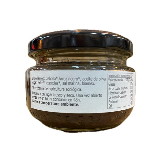 INGREDIENTES: Cebolla, Arroz negro, aceite de oliva virgen extra, especias, sal marina, biamex. (Productos procedentes de agricultura ecológica). 100% Vegetal, Sin conservantes, Sin colorante y Sin Gluten.