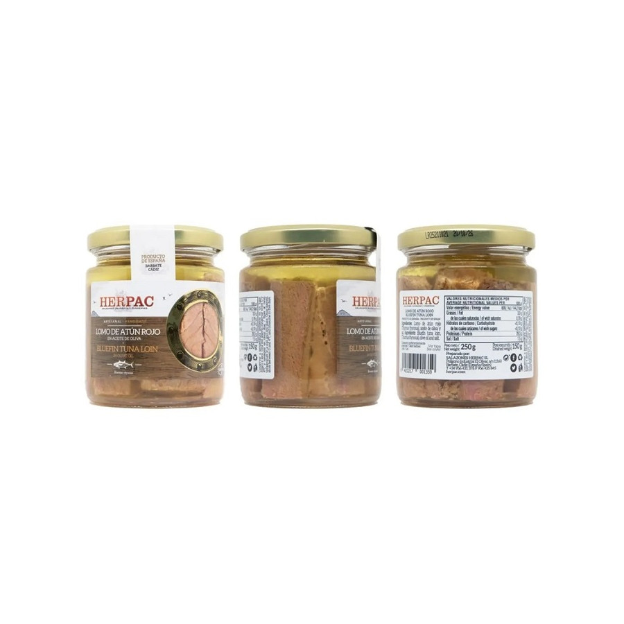 El lomo de atún rojo en aceite de oliva de Herpac (tarro de 250 g) es una delicatessen que combina la tradición marinera de Barbate, Cádiz, con una presentación cuidada en cristal que realza su valor gourmet. Cada pieza de lomo se selecciona con esmero para conservar su textura firme y su sabor profundo, potenciado por el aceite de oliva que aporta suavidad y un toque mediterráneo inconfundible. Este formato es ideal para quienes buscan disfrutar del atún rojo (Thunnus thynnus) de manera práctica y elegante, perfecto para abrir y servir directamente en la mesa. Puede degustarse solo, en tostas, ensaladas frescas o como ingrediente principal en recetas de alta cocina, siempre aportando un toque de distinción. Herpac, empresa familiar de Barbate y referente en el mundo de los salazones y conservas, mantiene en este producto la esencia de la almadraba gaditana, un método de pesca milenario que simboliza respeto por el mar y máxima calidad en el atún rojo. En Aires de Cádiz, tu tienda gourmet situada en la Calle San Francisco nº 15 de Cádiz capital y también disponible en nuestra tienda online, ponemos a tu alcance este tarro exclusivo para que disfrutes en casa de la auténtica excelencia gaditana. El tarro de 250 gramos no solo conserva el sabor puro del Atlántico, sino que también es un producto saludable, rico en proteínas y omega-3, pensado para quienes buscan lo mejor de la gastronomía de Cádiz con una presentación refinada.