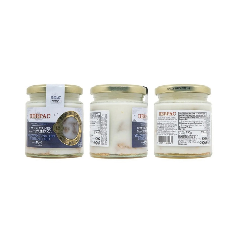El lomo de atún Yellowfin en manteca ibérica de Herpac (tarro de 250 g) es una creación única que fusiona el mejor atún de aleta amarilla con la tradición gastronómica andaluza de conservar en manteca. Esta elaboración aporta al pescado un sabor intenso, notas suaves y una textura sorprendente que lo convierten en una delicia diferente y exclusiva. El atún Yellowfin, conocido por su carne firme y su sabor equilibrado, encuentra en la manteca ibérica un aliado perfecto que potencia sus cualidades y lo transforma en un producto gourmet ideal para paladares curiosos y exigentes. El resultado es una conserva original, llena de carácter, que representa la innovación con raíces en la cocina tradicional de la provincia de Cádiz. Elaborado en Barbate por Herpac, empresa referente en salazones, ahumados y conservas, este tarro es fruto de la pasión por el mar y el respeto por los procesos artesanales que mantienen viva la esencia de la costa gaditana. Este lomo de atún en manteca ibérica puede disfrutarse solo, sobre pan rústico, en tostas, acompañado de encurtidos o como base de tapas creativas. Su sabor inconfundible lo convierte en una elección perfecta para sorprender en aperitivos y celebraciones. En Aires de Cádiz, tu tienda gourmet situada en la Calle San Francisco nº 15 de Cádiz capital y también disponible en nuestra tienda online, ponemos a tu alcance este producto exclusivo para que disfrutes en tu mesa de la autenticidad y la innovación de la gastronomía gaditana. Cada tarro de 250 gramos encierra un bocado diferente, que une el mar de Cádiz con la tradición ibérica en una conserva irrepetible.