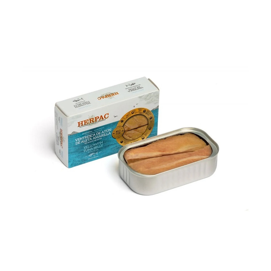 Es una de las conservas preferidas por los seguidores de Herpac, y lo entendemos. Nuestra ventresca de atún de aleta amarilla es un manjar al que es imposible resistirse, y en cuanto la probéis sabréis por qué decimos esto. La ventresca es la parte más jugosa del atún. Proviene de la barriga del atún. También se le llama ventrisca, ventrecha, mentresca, barriga, ijar… depende de la zona geográfica en la que nos encontremos. La ventresca de atún es considerada como una joya, por ello que es un producto muy apreciado y cotizado. Contiene un alto índice de grasa. Esto le aporta un gran y delicado sabor que le diferencia de cualquier otra carne del resto del atún, y una textura única irresistible para el paladar. La ventresca de atún de aleta amarilla es además un producto con un alto nivel de proteínas, con ácidos grasos omega 3 y 6, por lo que aporta beneficios a la salud, como por ejemplo, ayudar a reducir los riesgos de enfermedades cardiovasculares. La ventresca de atún en aceite de oliva es ideal para aperitivos como tostas, montaditos… un auténtico manjar al que es imposible resistirse. Disfruta de la mejor ventresca de atún en nuestras latas, que solo deben conservarse en un ambiente fresco y seco para su consumo. En definitiva, una dosis de placer para el paladar más exigente que no debes de dejar probar y comprar, a través de nuestra tienda online. Ingredientes: Ventresca de atún de aleta amarilla y aceite de oliva.