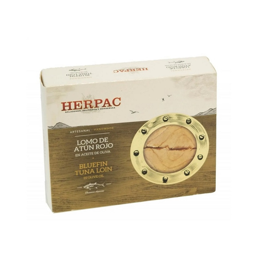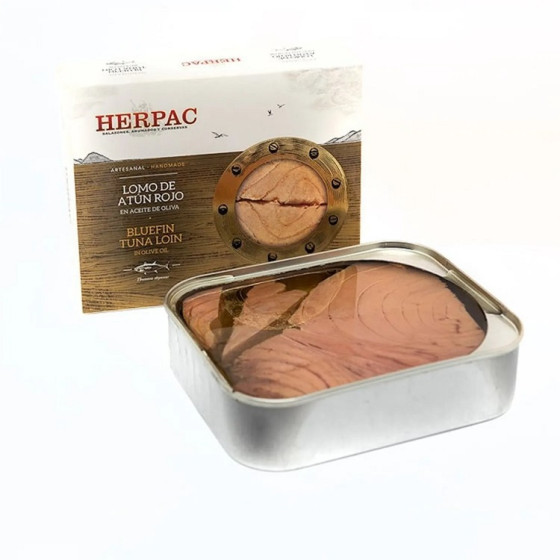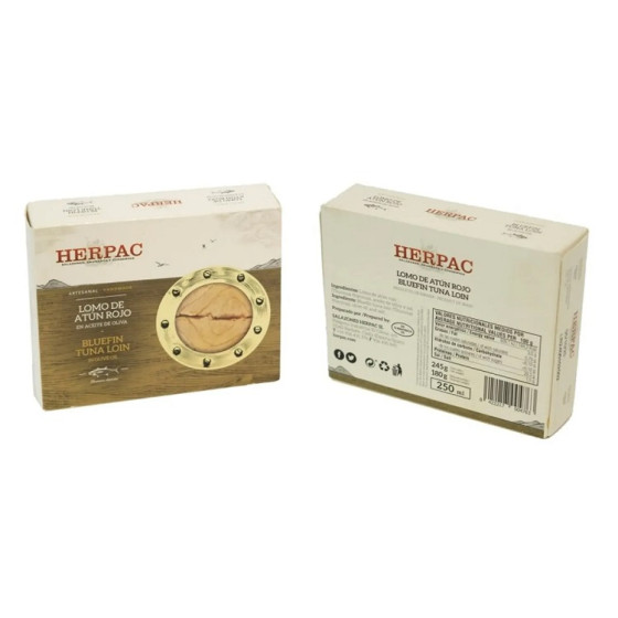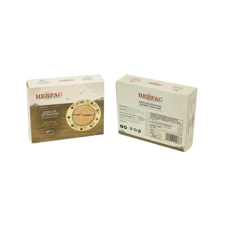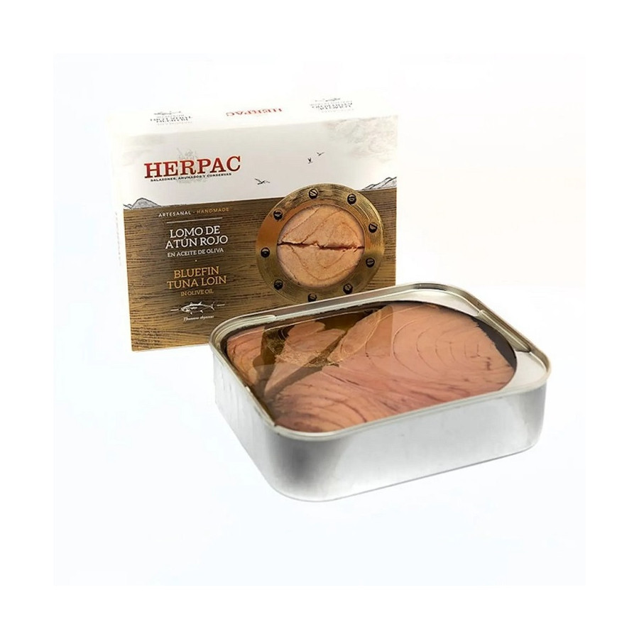 Lomo de atún rojo en aceite de oliva Herpac 245 g, conserva gourmet de Barbate con sabor auténtico y calidad premium. Disponible en Aires de Cádiz.