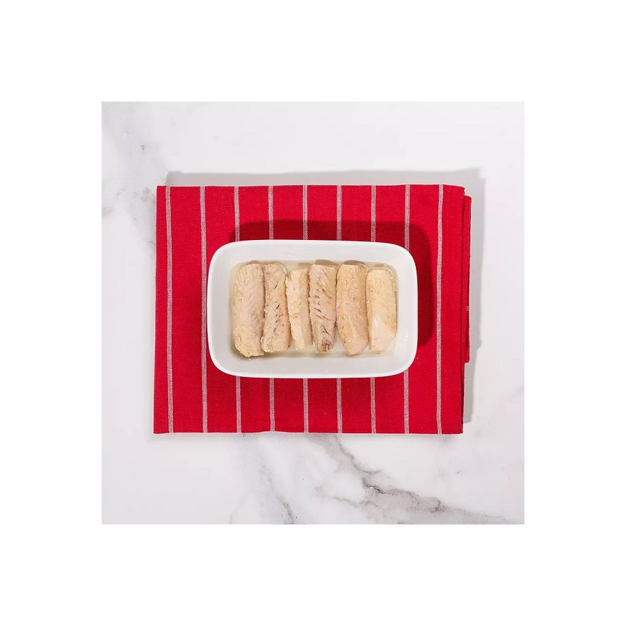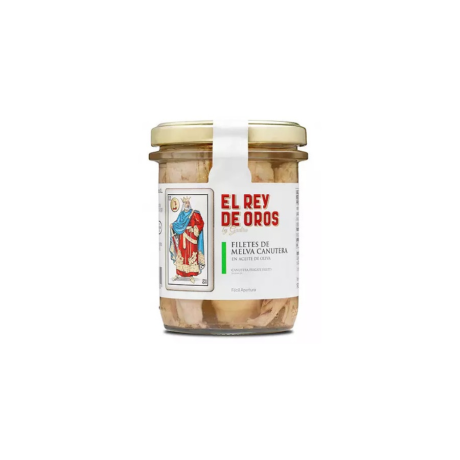 Tarro de melva canutera El Rey de Oros Es muy versátil, se puede utilizar en las ensaladas, de cualquier tipo, también en guisos, cocidos, en aliños, en sushi, en tostas, etc tiene un aroma y sabor inconfundible, así como unas grandes propiedades nutritivas. INGREDIENTES: Filete de melva canutera en aceite de oliva y sal. ALÉRGENOS: Pescados y productos a base de pescado (Melva). Conservar a temperatura ambiente en un lugar fresco y seco.