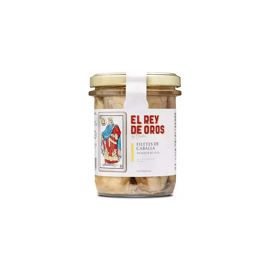 Tarro de filetes de caballa El Rey de Oros Desde el clásico bocadillo de caballa, para un aliño con papas cocidas o como base para una receta caliente. Los filetes de caballa nos brindan, en cuestión de minutos, una comida sana y nutritiva. INGREDIENTES: Filetes de caballa en aceite de oliva y sal. ALÉRGENOS: Pescados y productos a base de pescado (Caballa) Conservar a temperatura ambiente en un lugar fresco y seco.