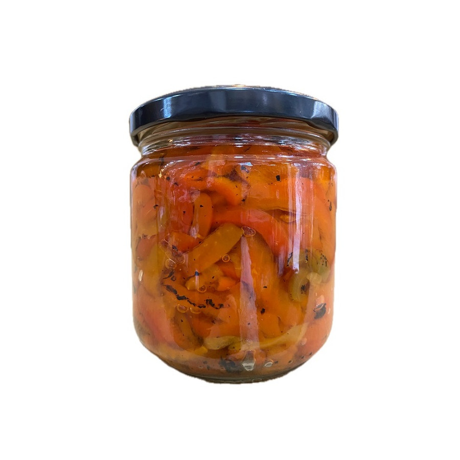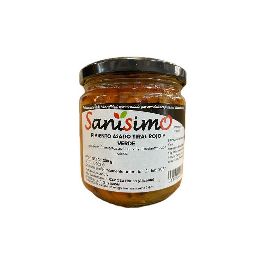 Pimiento asados en tiras rojos y verdes – Sanisimo Nuestro pimiento rojo asado en tiras, es un producto muy sano, elaborado a fuego lento con leña que nos permite mantener todo su sabor. No tiene aditivos añadidos como colorante ni conservantes
