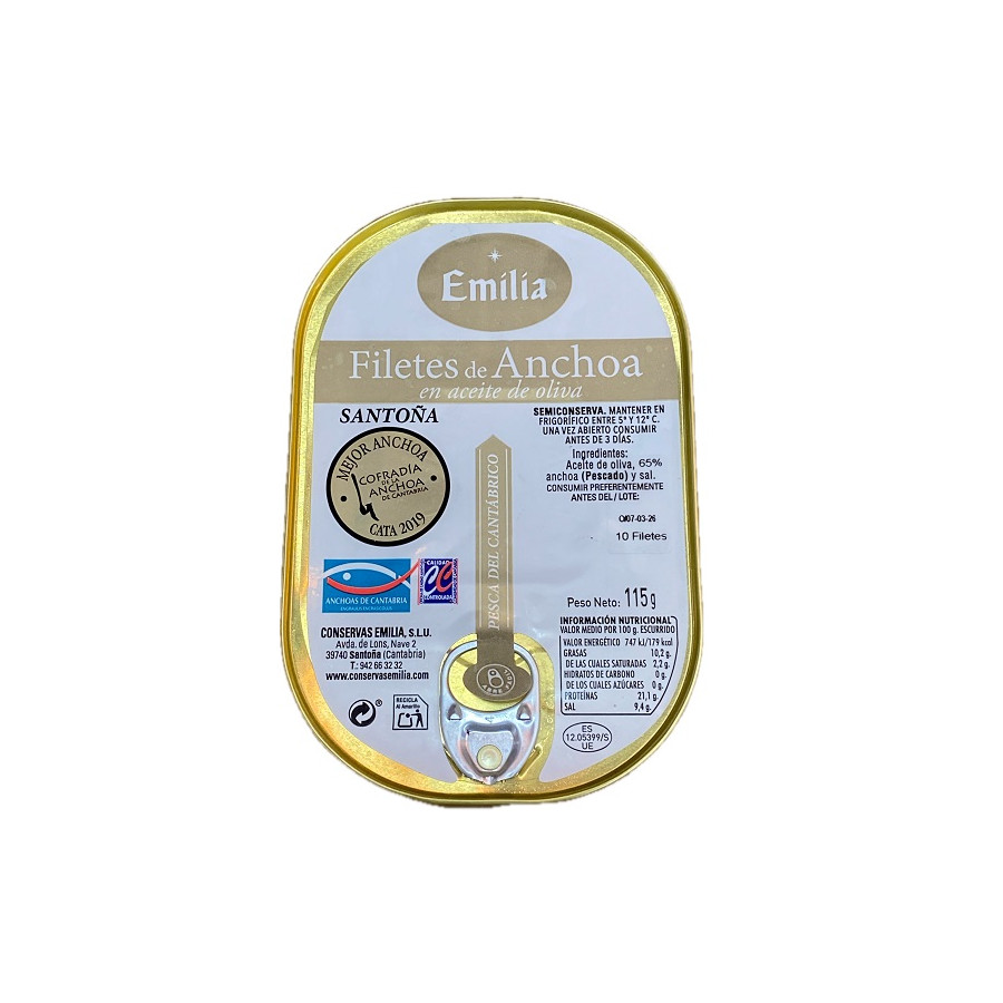 Filetes de anchoas del Cantábrico en aceite de oliva. Conservas Emilia Santoña. Lata de 115 g con 10 filetes de máxima calidad.