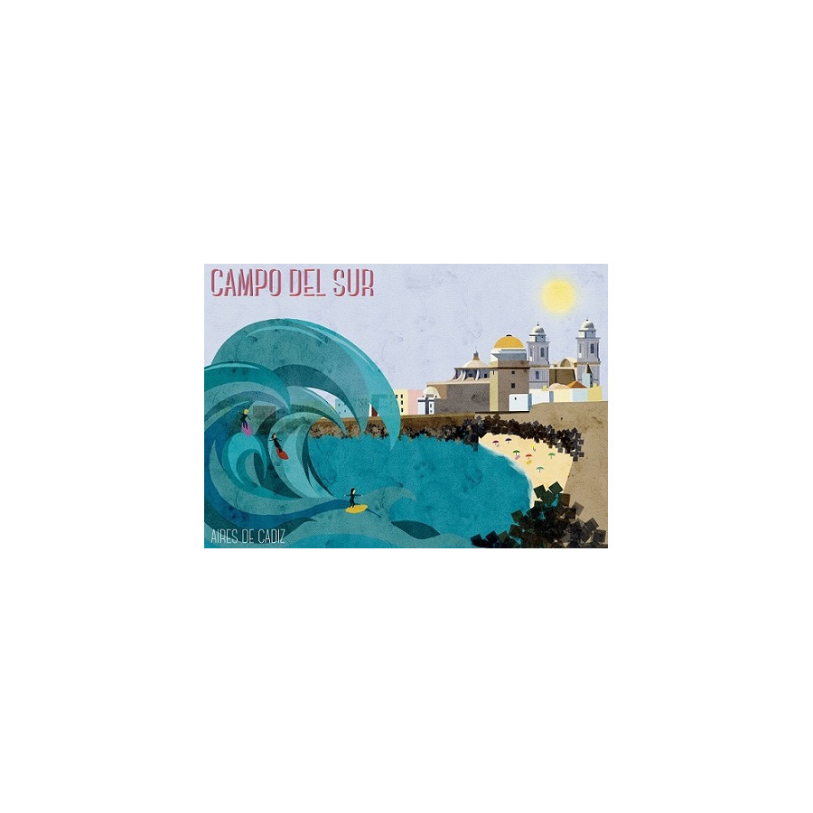 Imán de souvenir de Cádiz flexible de 10,5 x 7,5 cm que representa el icónico Campo del Sur, parte del paseo marítimo de la ciudad. En primer plano se aprecian grandes olas con surfistas disfrutando del mar, mientras que a la derecha se ve una pequeña playa. Al fondo, a la derecha, se distingue la imponente Catedral de Cádiz vista desde su parte trasera, aportando un toque arquitectónico y cultural a la escena. Esta ilustración combina la energía del litoral gaditano con la belleza de su patrimonio, creando un recuerdo único de la ciudad. Ideal para neveras, pizarras o colecciones de souvenirs, destaca por su diseño detallado y acabado flexible de alta calidad. Disponible en Aires de Cádiz, tanto en la tienda física en Calle San Francisco nº 15, Cádiz capital, como en la tienda online www.airesdecadiz.com , este imán flexible del Campo del Sur captura la vida, el mar y la esencia gaditana en cada detalle.