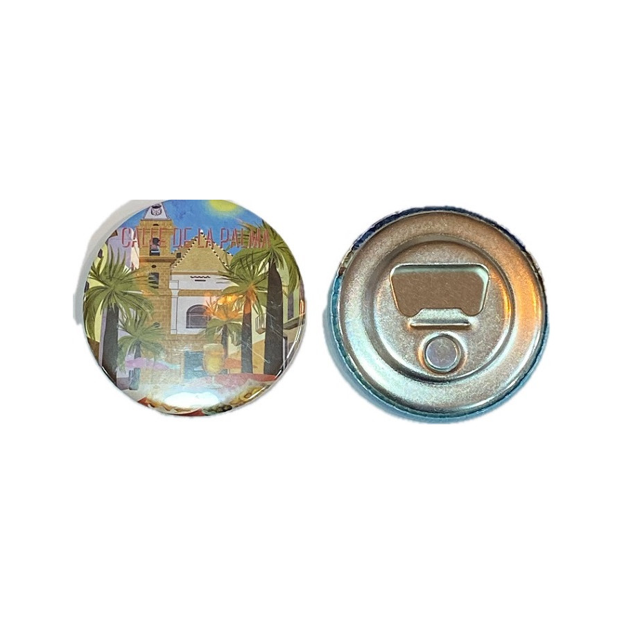 Imán metálico redondo 5,8 cm con abridor y diseño de la calle Virgen de la Palma, terrazas y pescaíto frito, souvenir de Cádiz.