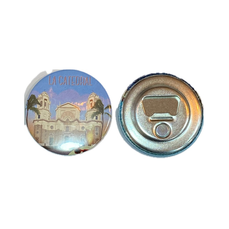 Imán metálico redondo 5,8 cm con abridor y diseño de la Catedral de Cádiz, palmeras y terraza gaditana, recuerdo único.