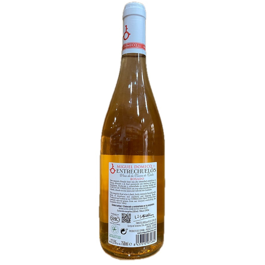 Entrechuelos Rosado – Bodegas Miguel Domecq . En el corazón de la campiña jerezana, donde la tierra albariza guarda siglos de historia vitivinícola, nace Entrechuelos Rosado, una joya singular de las Bodegas Miguel Domecq. Este vino expresa como pocos la armonía entre tradición y modernidad, entre el carácter del terruño y la frescura de una elaboración cuidada al detalle. Elaborado a partir de las variedades Syrah y Merlot, vendimiadas al alba para conservar su expresión más fresca, este rosado se vinifica con prensado suave y fermentación controlada a baja temperatura. El resultado es un vino joven, elegante y limpio, que conserva la pureza de la fruta sin maquillajes. Notas de cata: Color: Rosa pálido con reflejos salmón, brillante y sugerente. Nariz: Aromas intensos a frutas rojas (fresa silvestre, cereza, grosella), con notas florales y un fondo ligeramente cítrico. Boca: Entra con suavidad pero sorprende con viveza. Equilibrado, con acidez refrescante, paso sedoso y final persistente, dejando un recuerdo frutal muy agradable. Maridaje Ideal como aperitivo o acompañando mariscos, arroces, pescados blancos, sushi o platos de cocina mediterránea. También perfecto para una copa al atardecer junto al mar o en una terraza entre amigos. Ficha técnica: Variedades: Syrah (principal), Merlot Grado alcohólico: 12,5 % vol. Temperatura de servicio: 6–8 °C Formato: Botella de 75 cl Denominación: Vino de la Tierra de Cádiz.
